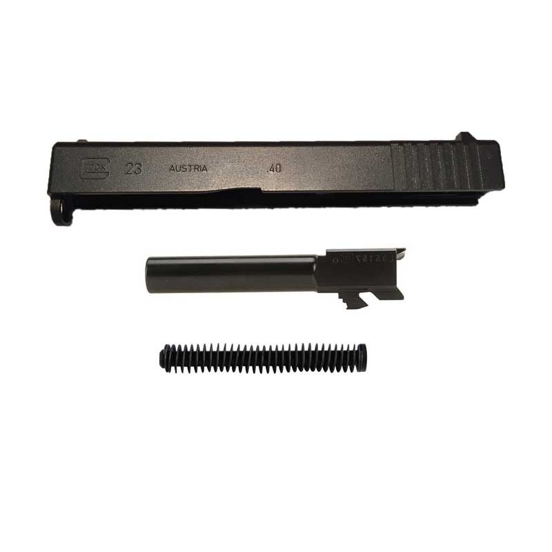 Factory Glock 27 OEM Gen 3 Complete Slide is taken from a brand new Factory Glock 27 Subcompact handgun. Â Its’ only been test fired by Glock and is ready to slide on as a replacement to an older Gen 3 subcompact slide you have or as the finishing touch to your 80% Glock compatible subcompact home pistol build. Â It includes the original 3.43″ barrel, recoil spring assembly, and all upper parts installed and ready to go.