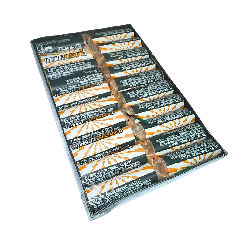 TITANBLITZ crackling 5 firecrackers, a true classic from 2017 with 5g of pyrotechnics and 2g of effect, produced under the FUNKE brand. The package contains 20 pieces of TITANBLITZ crackling 5 firecrackers.  TITANBLITZ crackling 5 firecrackers are classified as category P1, so they are freely available for sale from the age of 21.