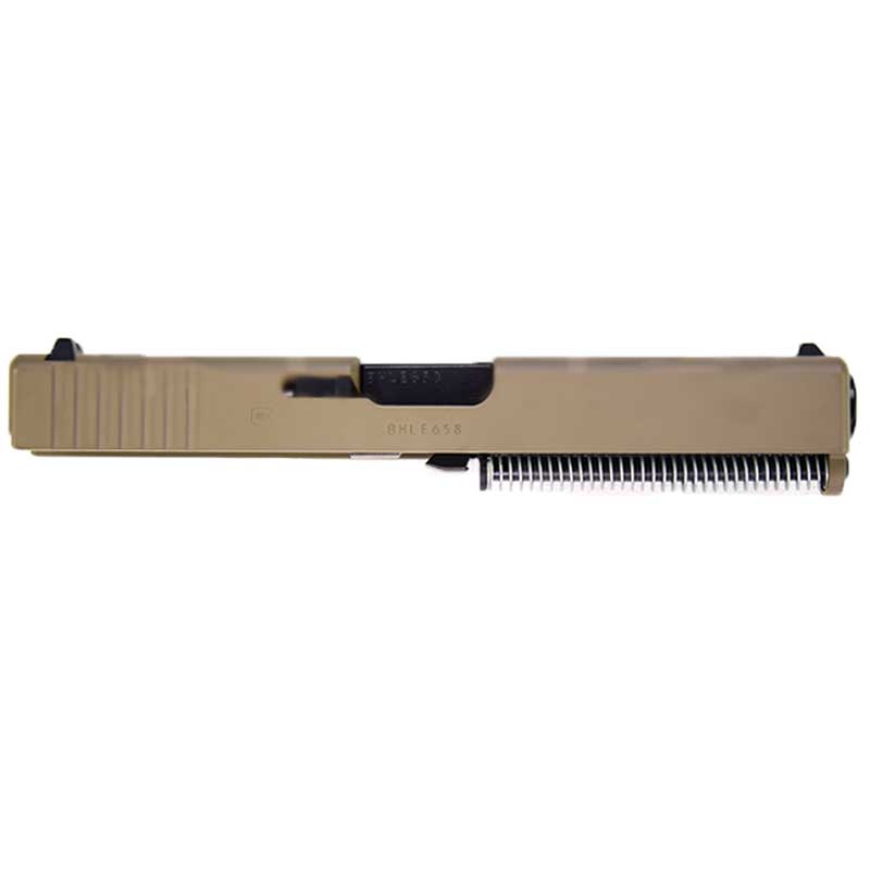 Factory New Glock 20 OEM Gen 3 Complete Slide is taken from a brand new Factory Glock 20SF (Short Frame) and professionally Cerakote in Magpul FDE (Flat Dark Earth). Â Its’ only been test fired by Glock and is ready to slide on as a replacement to an older Gen 3 slide you have or as the finishing touch to your 80% Glock compatible home gun build with an FDE G20SF slide. It comes with all Glock Factory parts, OEM 4.61″ barrel, recoil spring assembly, and all upper parts installed and ready to ship.