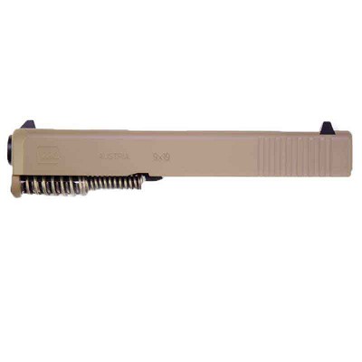 Factory New Glock 43 OEM Gen 3 Complete Slide is taken from a brand new Factory Glock 43 and professionally Cerakote in Magpul FDE (Flat Dark Earth). Its’ only been test fired by Glock and is ready to slide on as a replacement to an older Gen 3 slide you have or as the finishing touch to your 80% Glock compatible home gun build with an FDE G43 slide. It comes with all Glock Factory parts, OEM 3.41″ barrel, recoil spring assembly, and all upper parts installed and ready to ship.